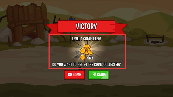 3、成功完成关卡后,获得金币奖励。可选择点击“CLAIM”观看广告获取4倍金币奖励,或者点击“GOHOME”返回主界面。