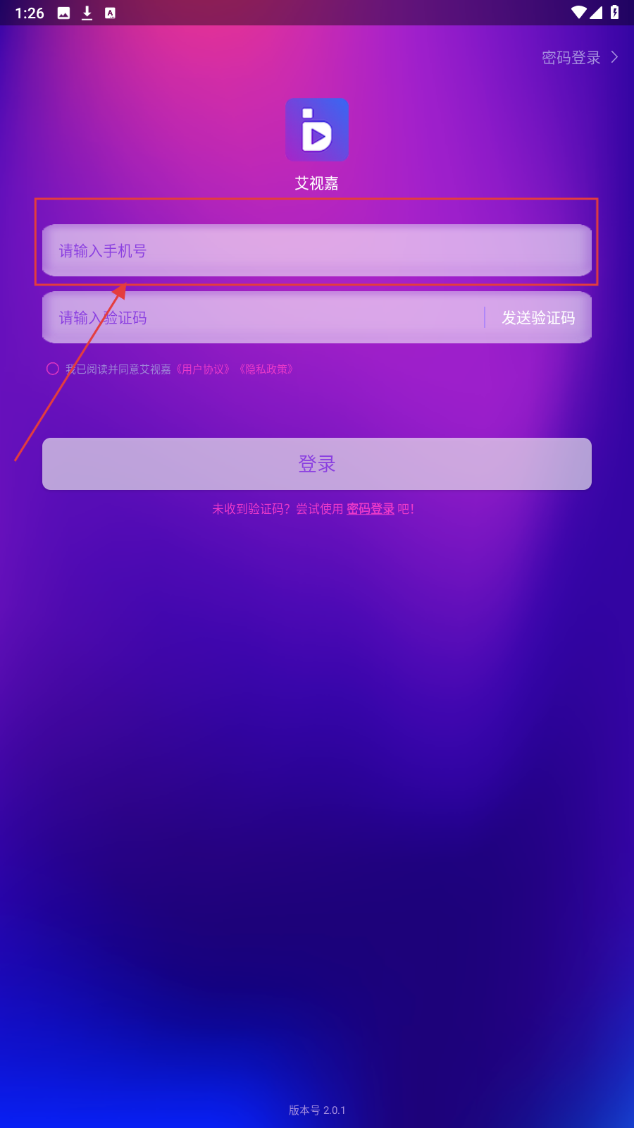 1、打开应用登录页,在【请输入手机号】栏填入手机号码。