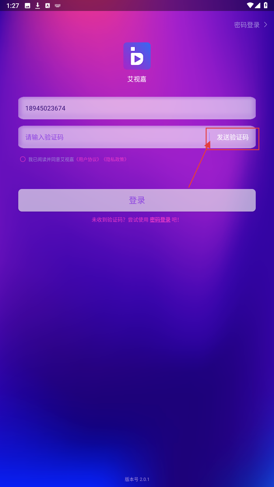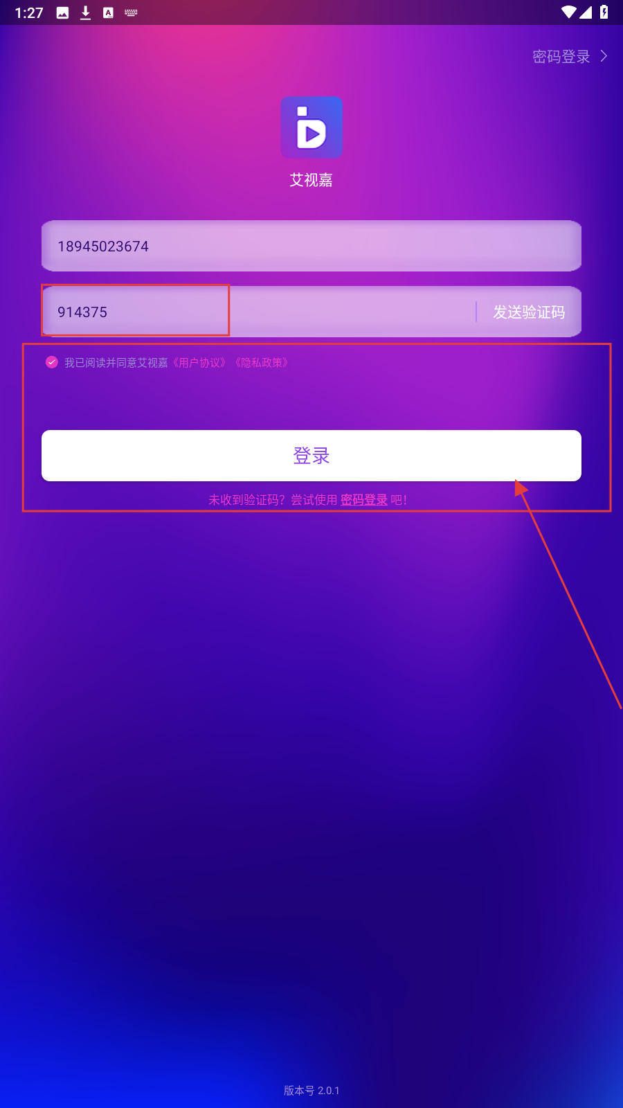 3、勾选【我已阅读并同意艾视嘉《用户协议》《隐私政策》】,点击【登录】完成登录。