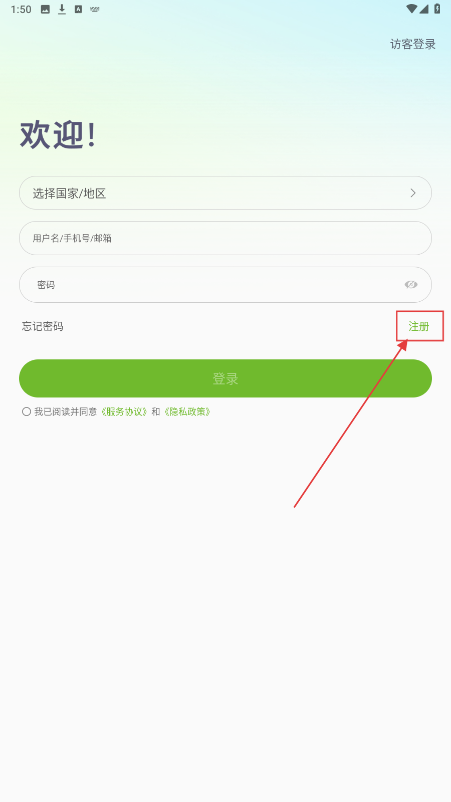 1、打开应用登录页,点击【注册】按钮,进入注册界面。