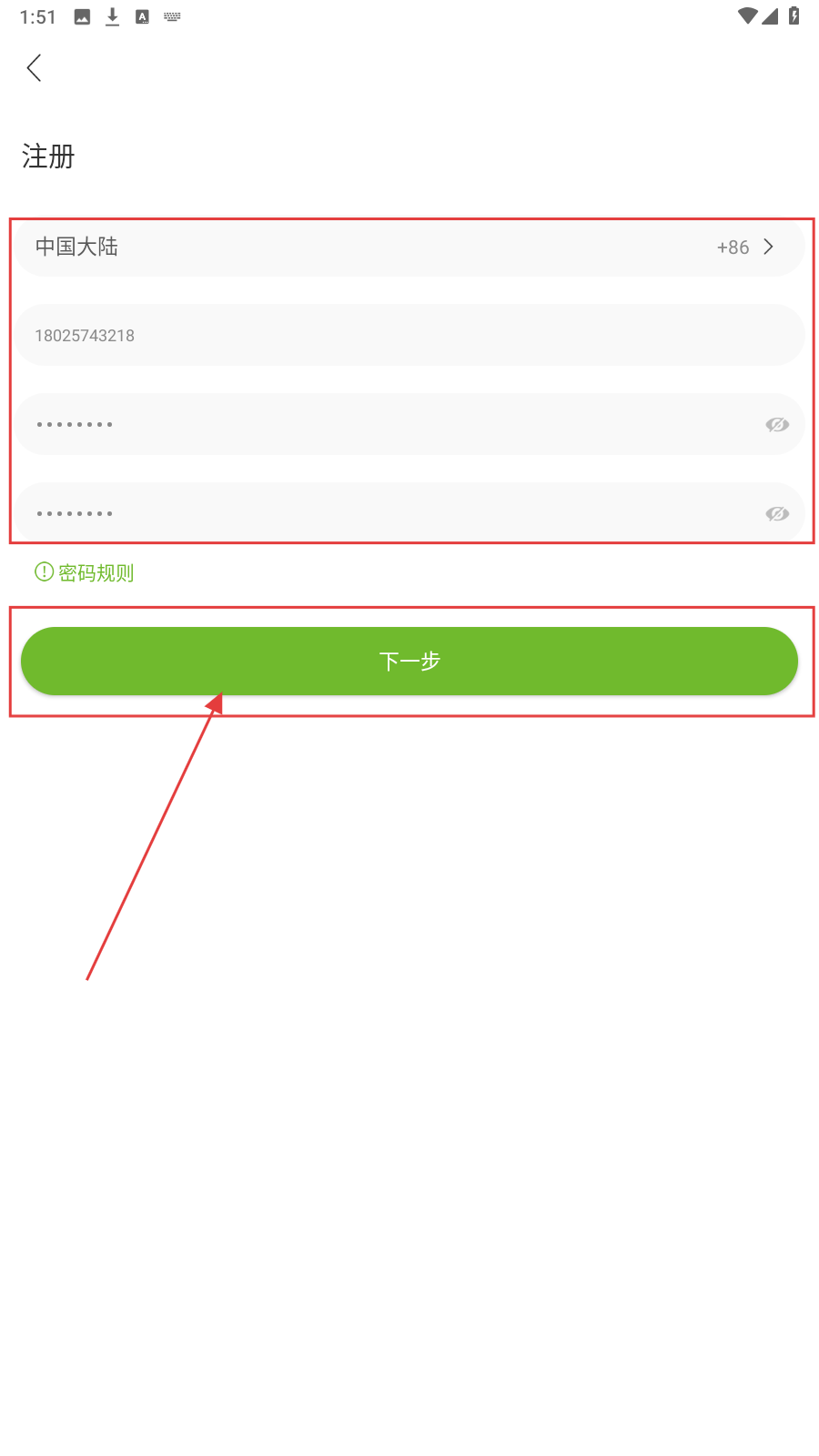 2、在注册页选择国家/地区(如中国大陆),填写手机号、密码,点击【下一步】。