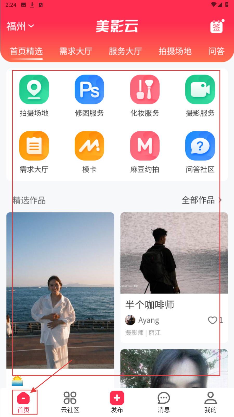 3、登录后自动返回【首页】,可使用拍摄场地、修图服务等功能,浏览精选作品。