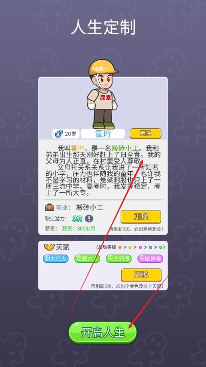 1、在“人生定制”界面,可查看角色初始信息和天赋。确认或调整信息后,点击“开启人生”进入游戏。