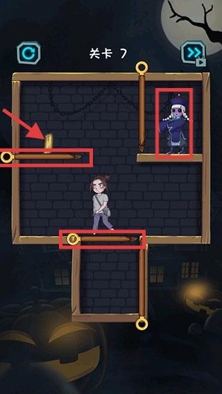 1、在关卡界面,观察场景布局,利用拉环机关,合理规划操作顺序,帮助角色躲避鬼怪并获取金币等奖励。