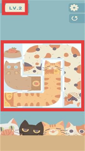 2、随着关卡提升(如LV.2),画面可能会出现拼图等更复杂元素,认真观察图案细节,把猫咪和食盆的图案完整拼接匹配,完成关卡目标。