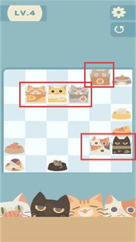 3、到LV.4等更高关卡,图案数量和难度增加,需要更细心地对比猫咪和食盆的图案、颜色、形状等特征,快速准确地进行匹配。