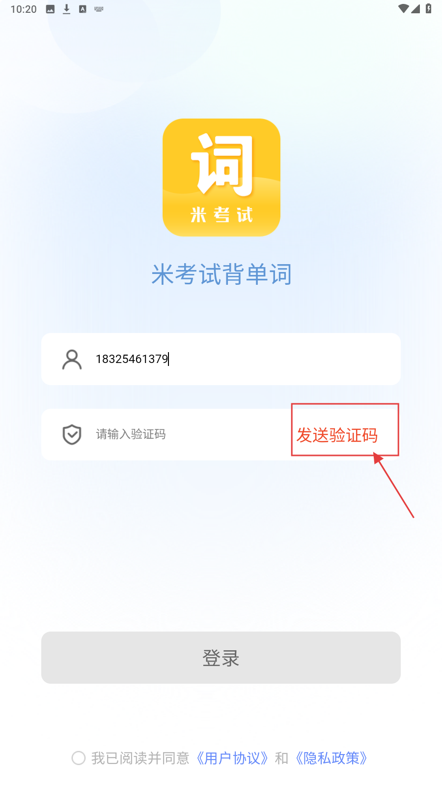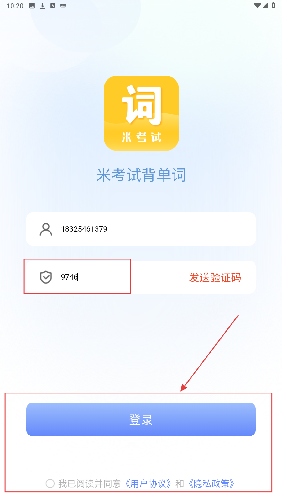 3、勾选【我已阅读并同意《用户协议》和《隐私政策》】,在【请输入验证码】栏填入验证码,点击【登录】完成登录流程。