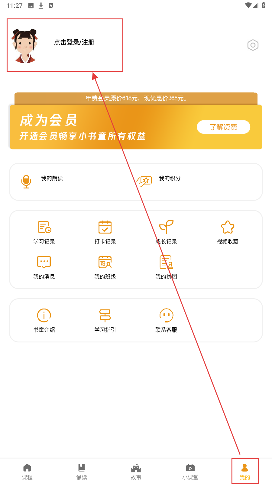 1、进入应用【我的】页,点击【点击登录/注册】区域。