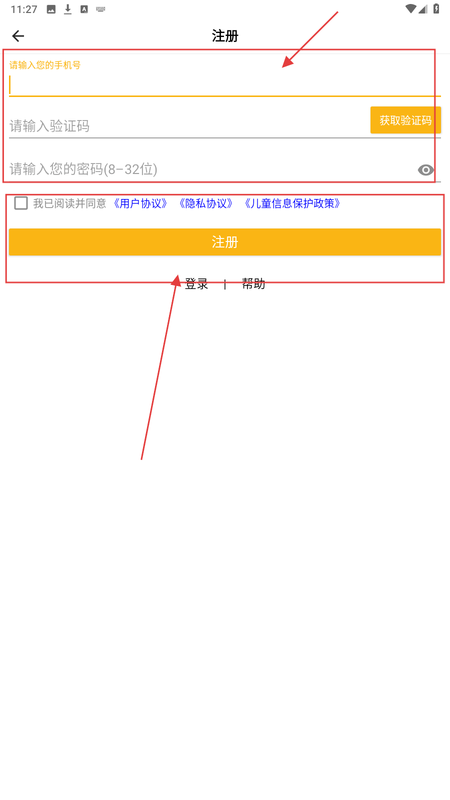 3、在注册页依次填入手机号、获取并填入验证码、设置密码,勾选同意协议后点击【注册】,完成账号注册流程。