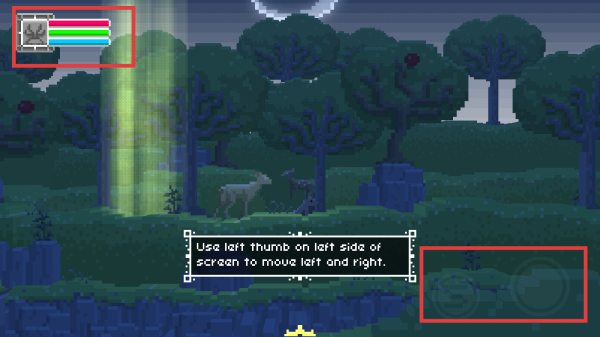 1、游戏开始,留意左上角的状态条,彩色部分可能代表生命值、能量值等重要状态。根据屏幕提示,用屏幕左侧控制角色左右移动。