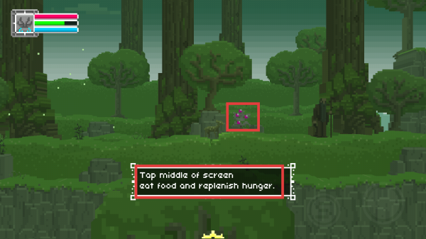 3、当屏幕提示“Topmiddleofscreeneatfoodandreplenishhunger.”时,点击屏幕上方中间的食物补充饥饿值,维持角色状态。