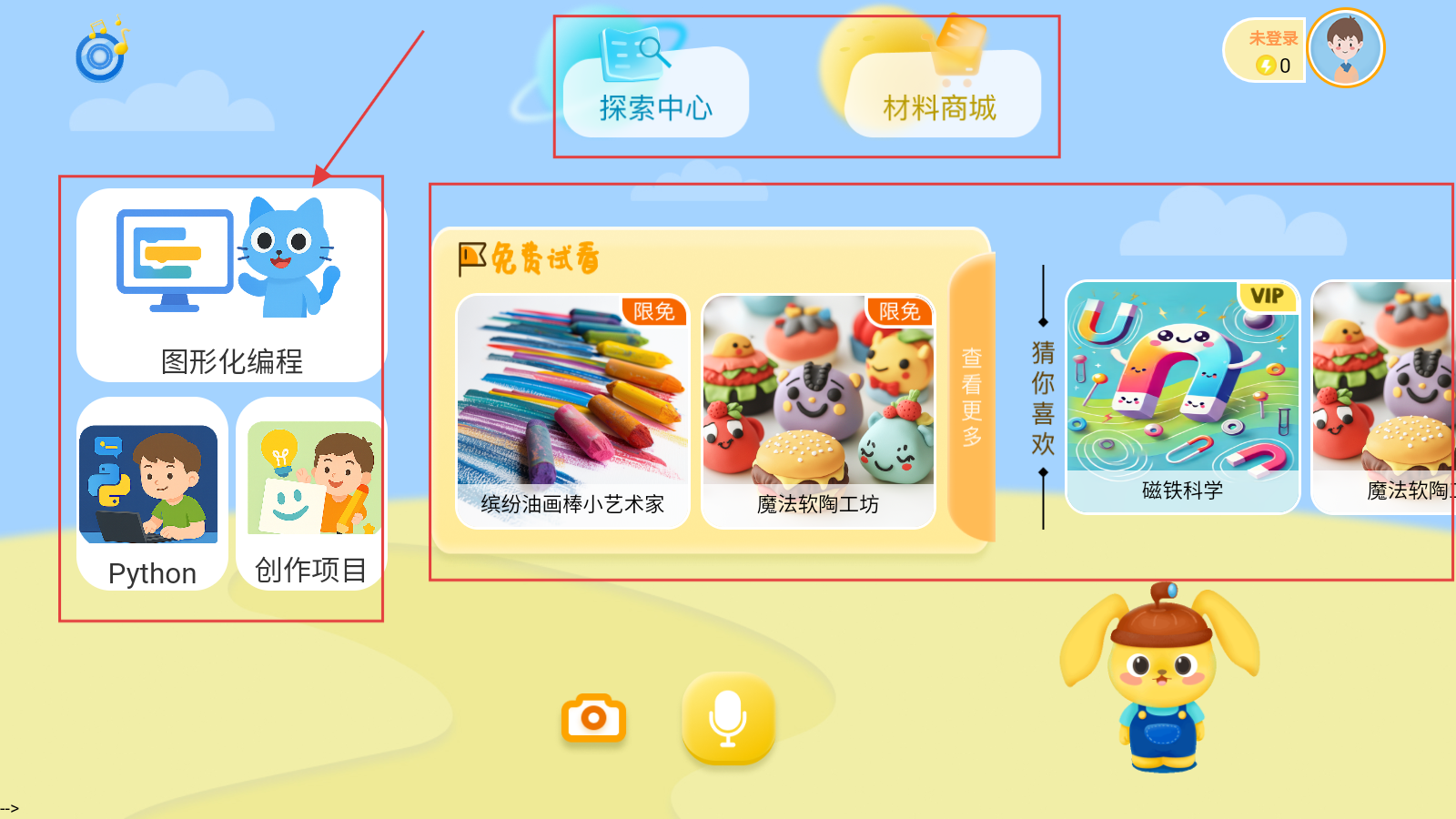 1、进入编程学习应用首页,选择编程类型(图形化编程/Python/创作项目)。