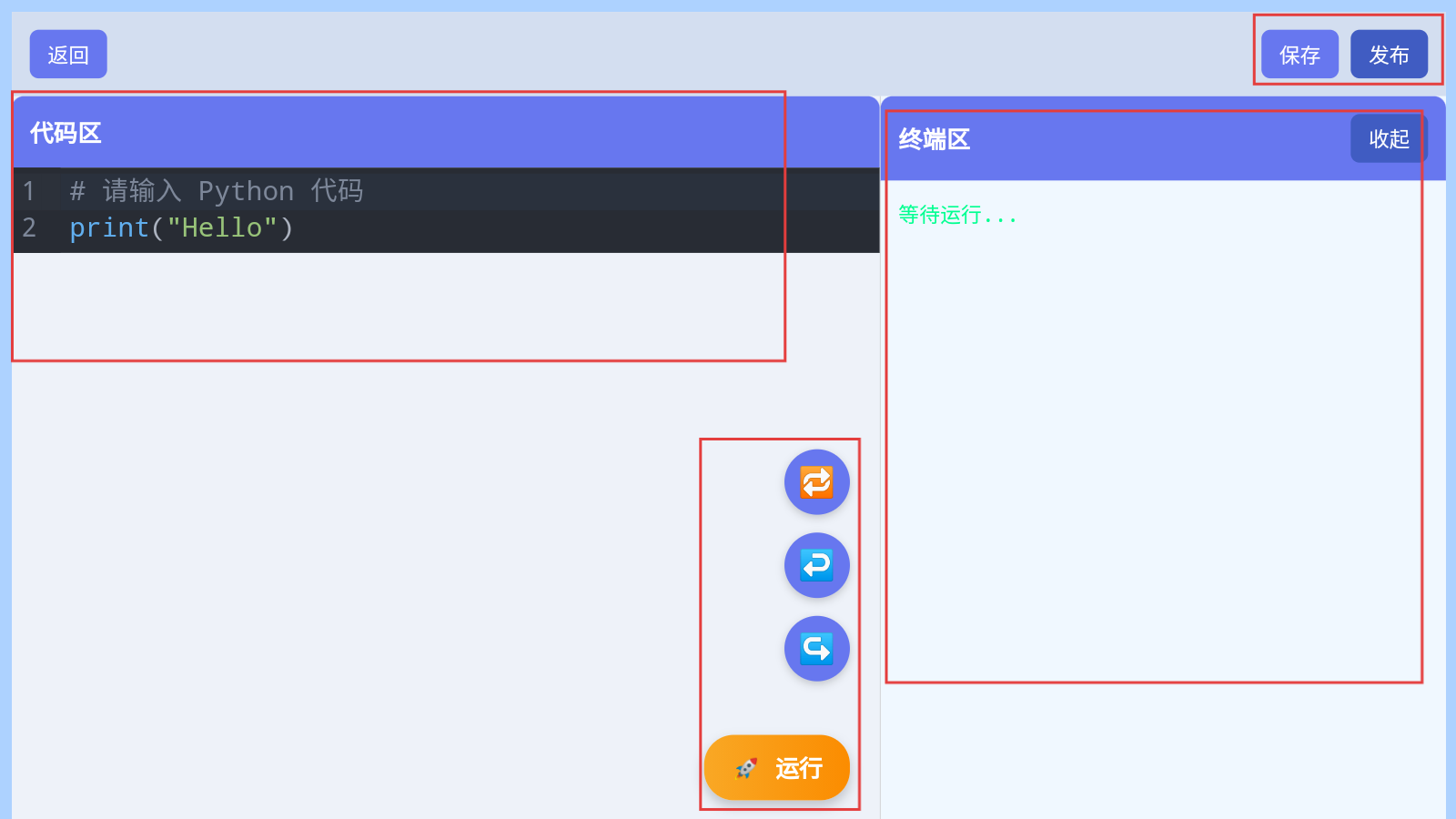 2、进入编程页,可以在图形化编程拖积木指令、Python输入代码等,点击【运行】测试。