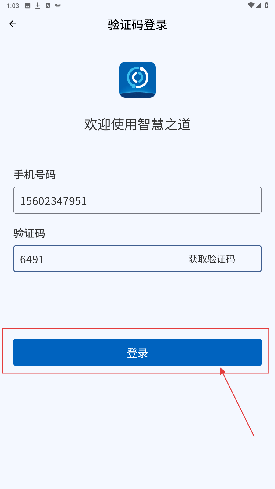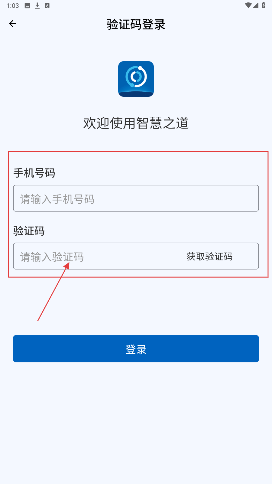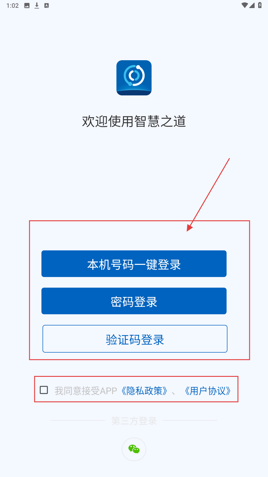 1、打开“智慧之道”应用登录页,勾选【我同意接受APP《隐私政策》、《用户协议》】,选择【验证码登录】。