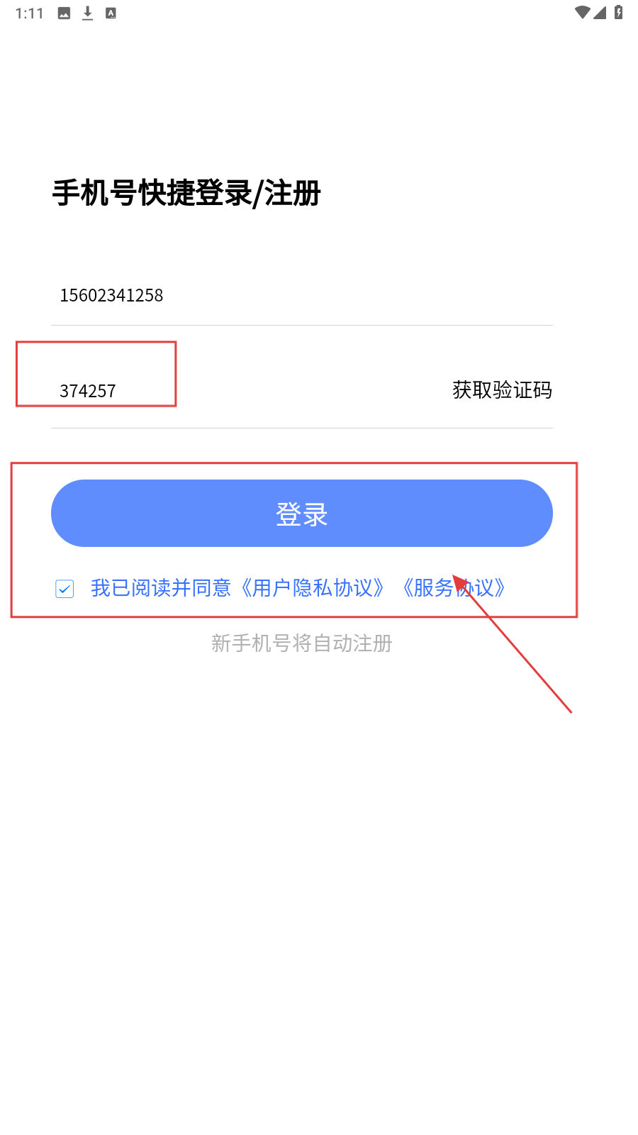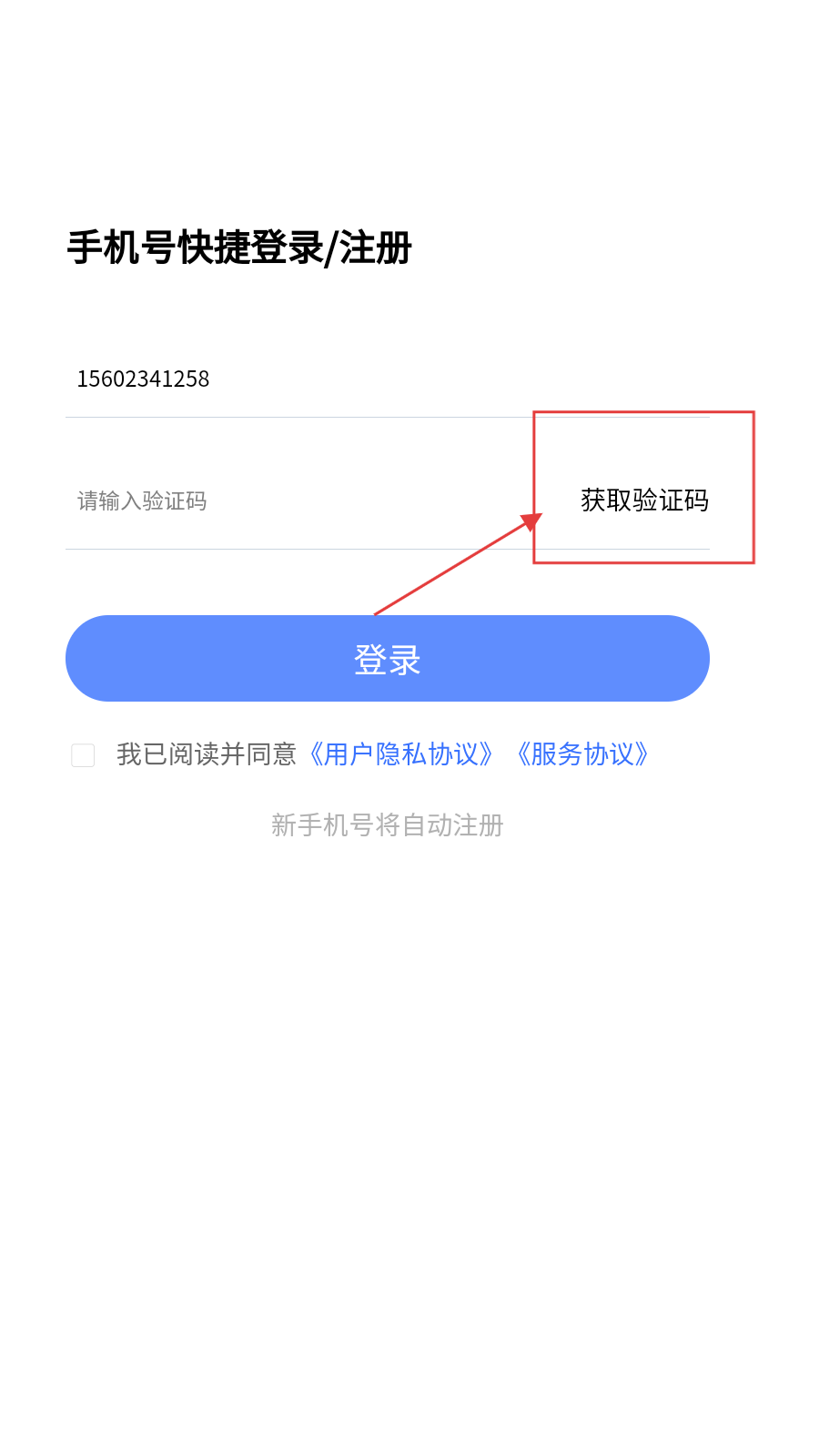 2、点击【获取验证码】,接收并填入验证码,勾选【我已阅读并同意《用户隐私协议》《服务协议》】。