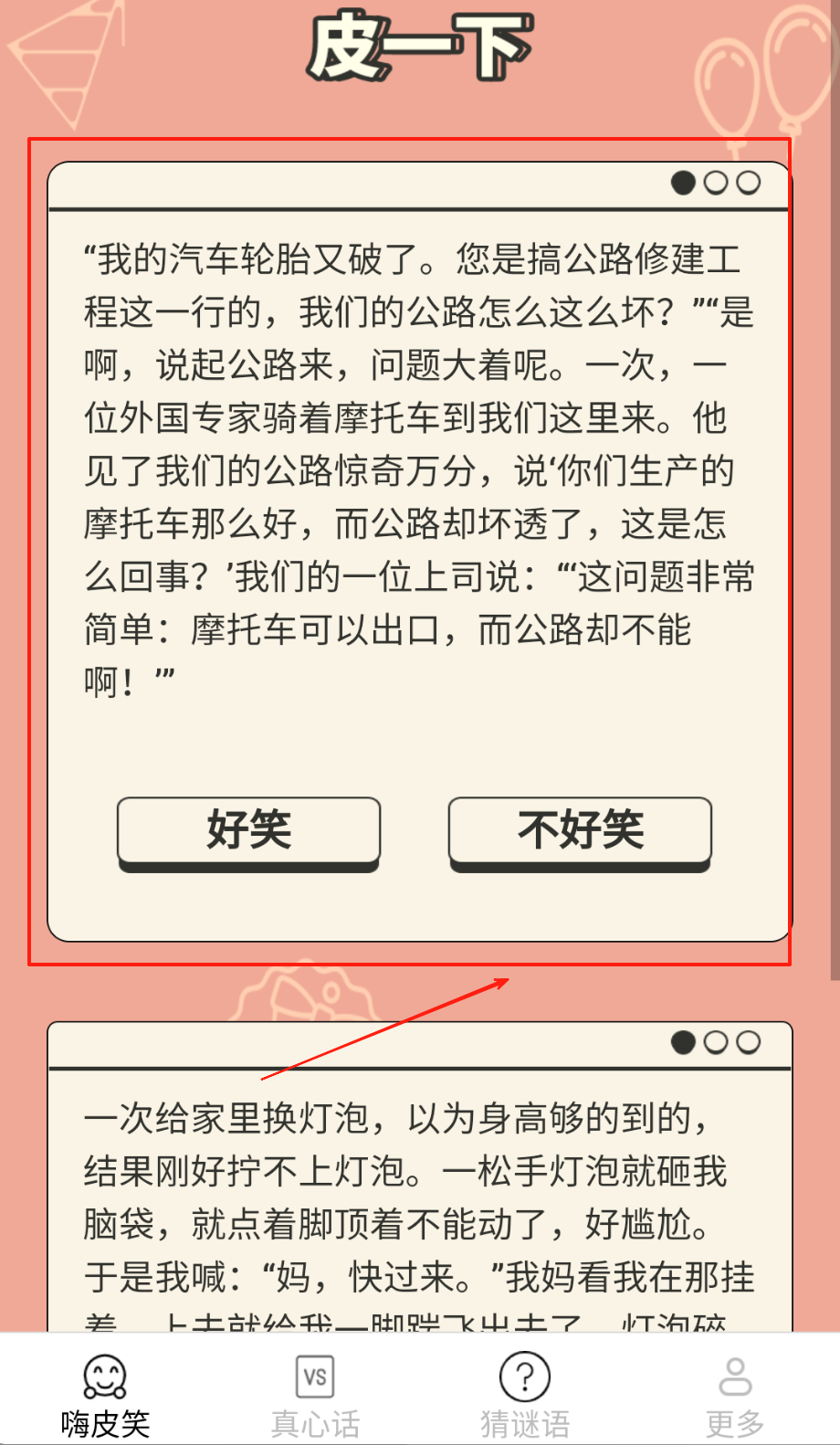 1、下载安装一起来嗨皮后打开软件,进入嗨皮笑页面即可浏览各种笑话,根据个人喜好阅读并给予评价。