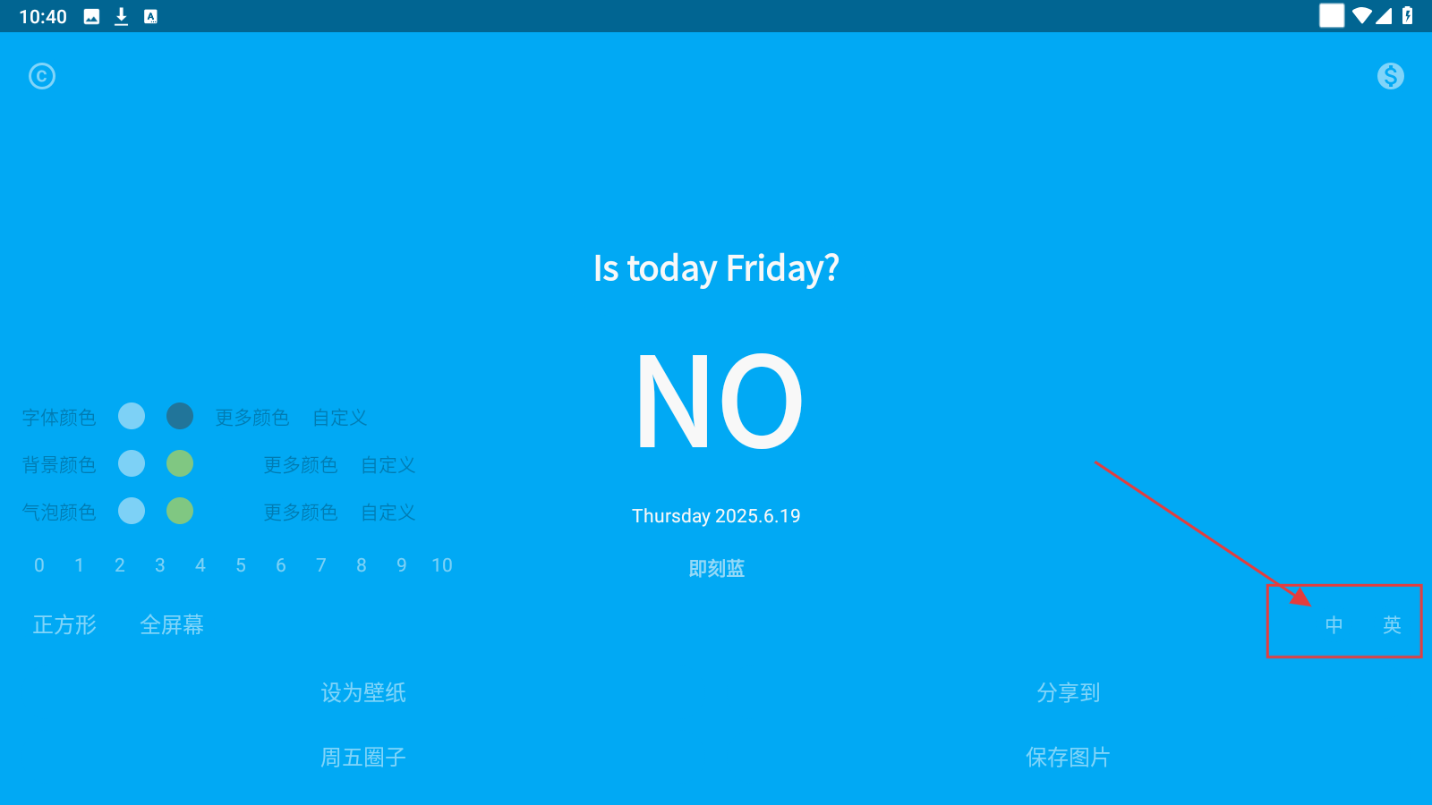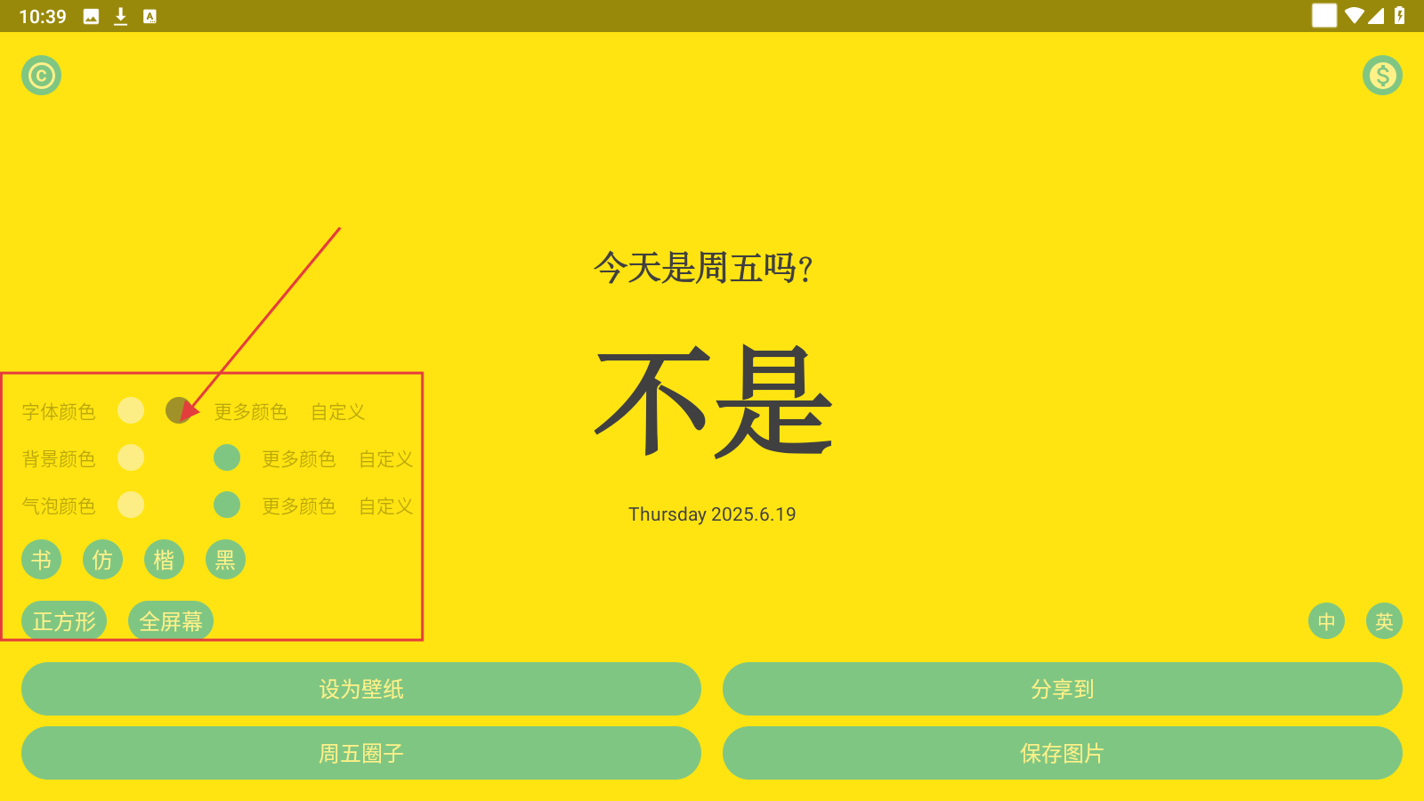 2、确认文字(“今天是周五吗?不是”及英文等)、样式设置后,点击【设为壁纸】等功能(或分享/保存)。