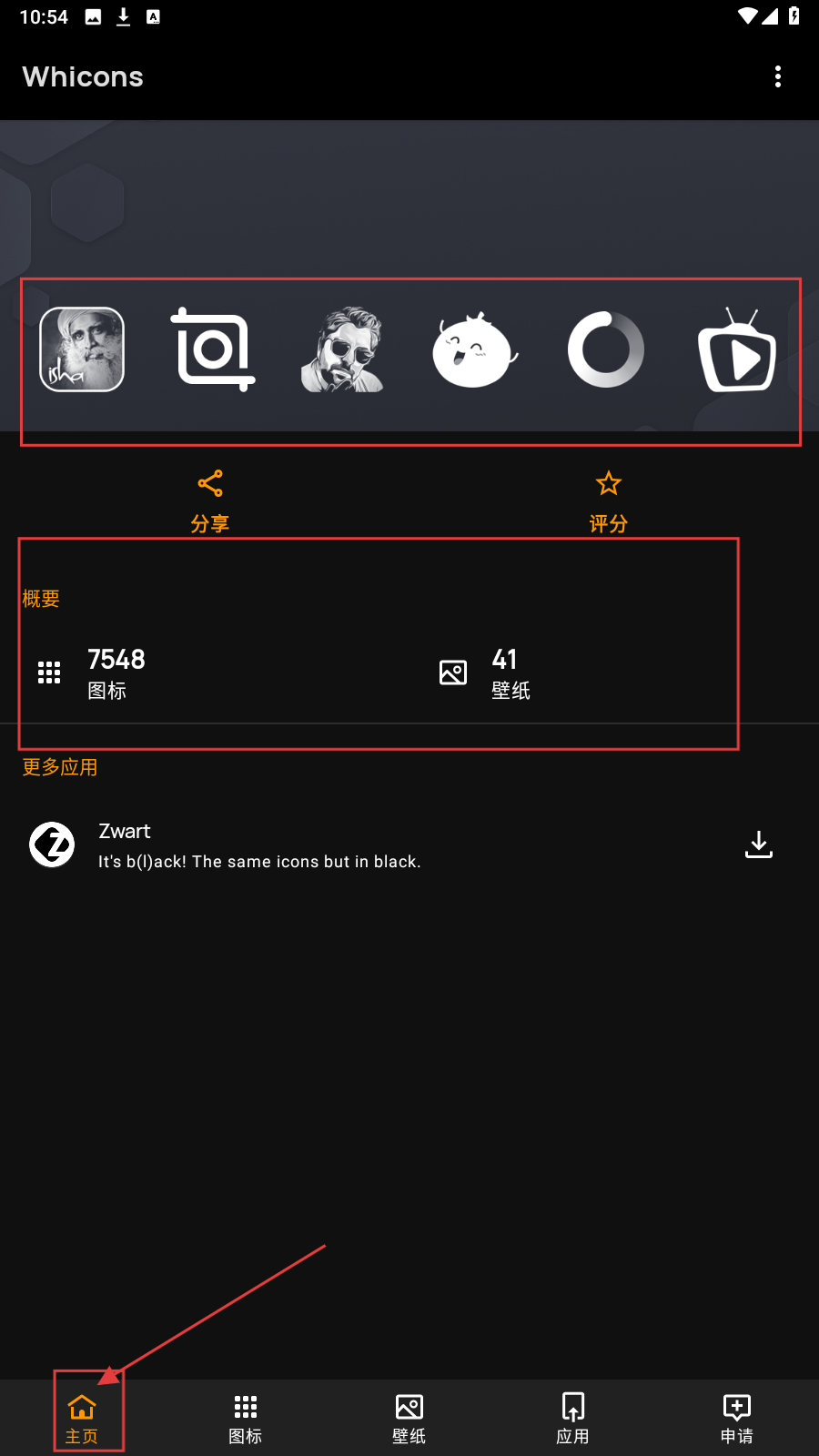1、打开应用,在【主页】浏览应用信息(图标/壁纸数量、分享/评分功能等)。