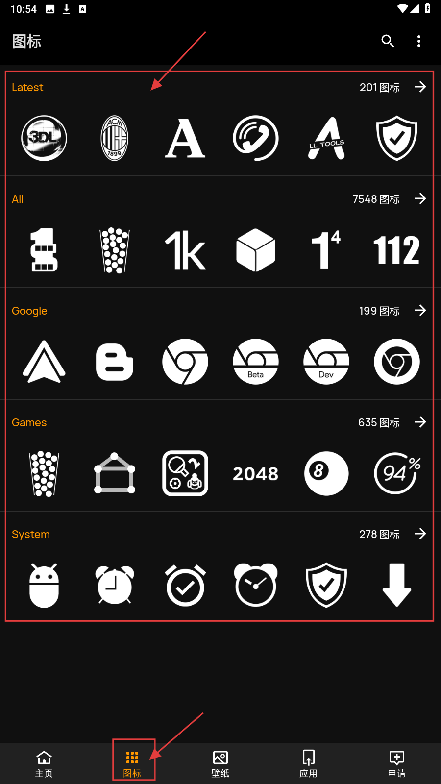 2、切换至【图标】页,选分类(Latest/All/Google等),进入对应图标列表。