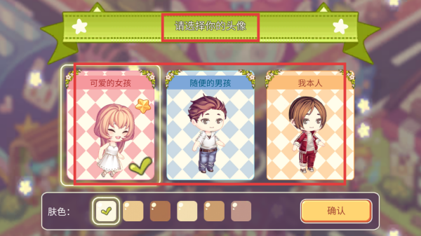 1、游戏初始,根据喜好从“可爱的女孩”“随便的男孩”“我本人”中选择头像,还可按需调整肤色,点击“确认”完成角色设定。
