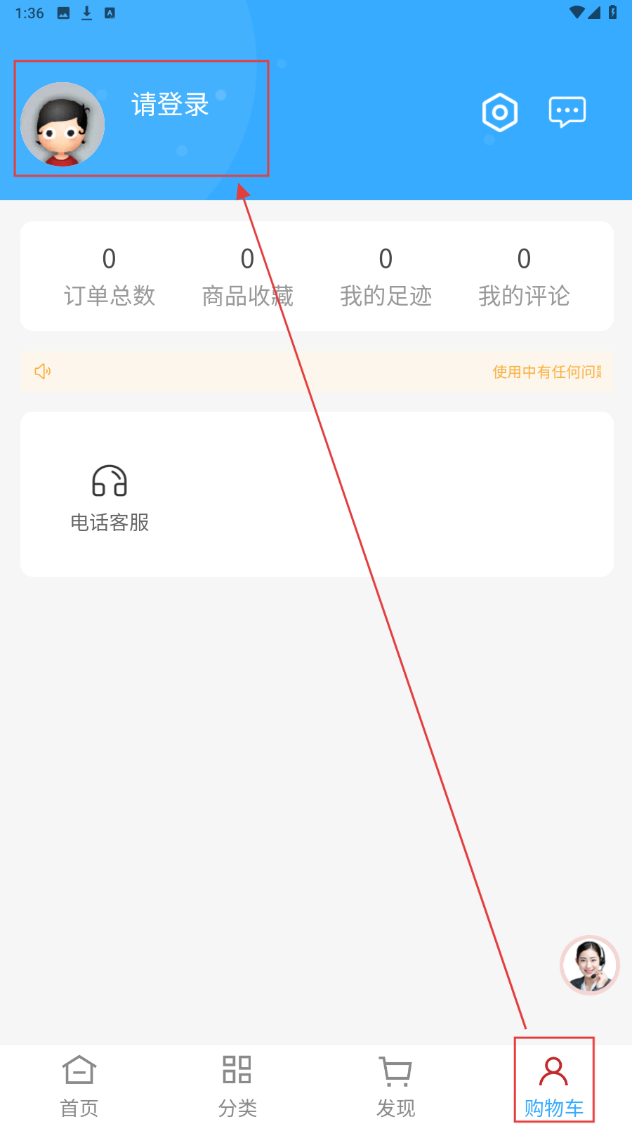 1、打开应用,在【购物车】页,点击左上角【请登录】入口。