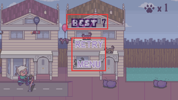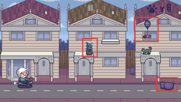 2、行进过程中,躲避街道上的障碍物(如紫色石头、盆栽、气球、炸弹),收集对应物品增加收集计数(如爪印×1)。