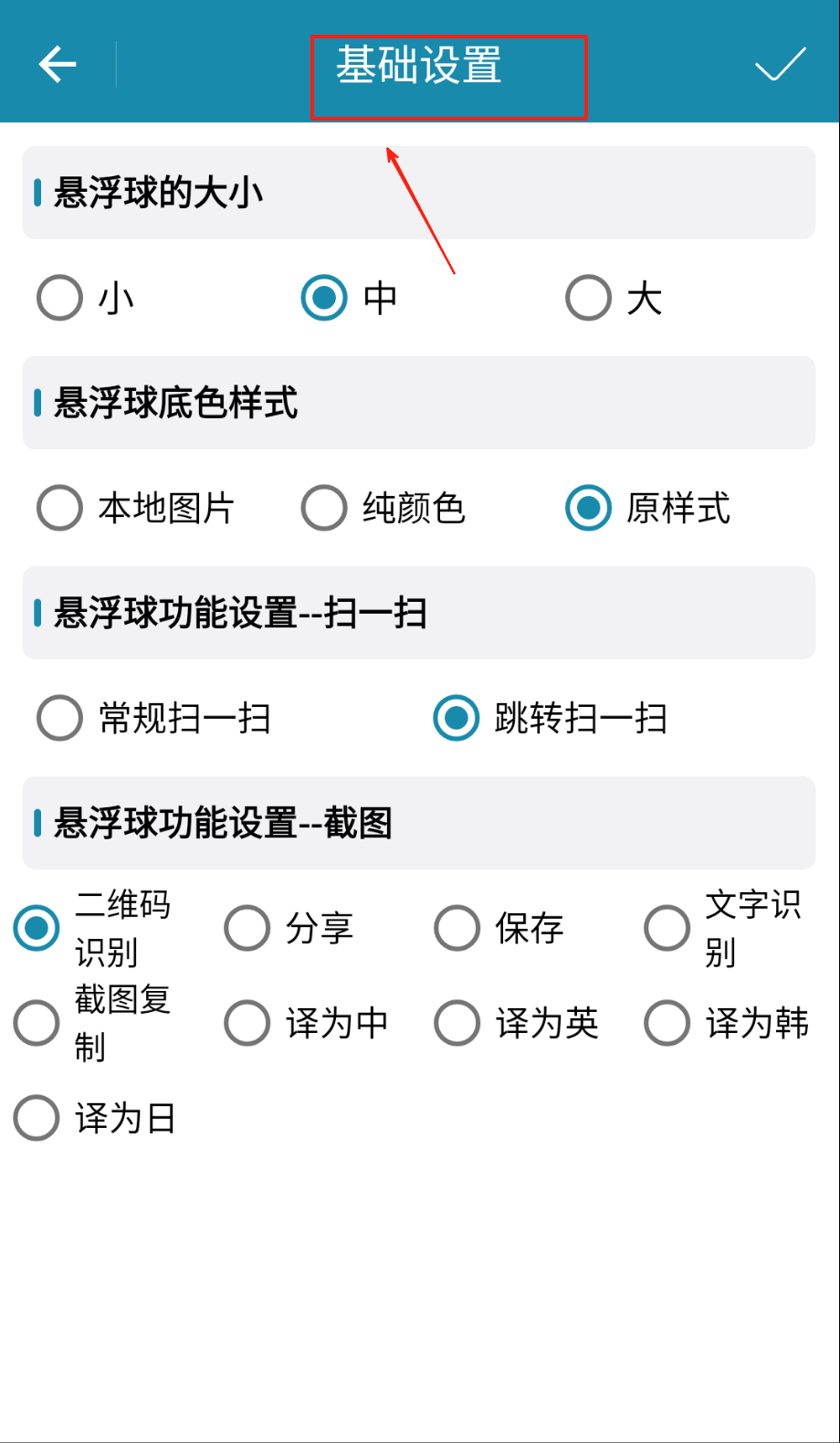 2、进入设置界面可调整悬浮球大小与样式,自定义透明度与触发区域提升使用体验。
