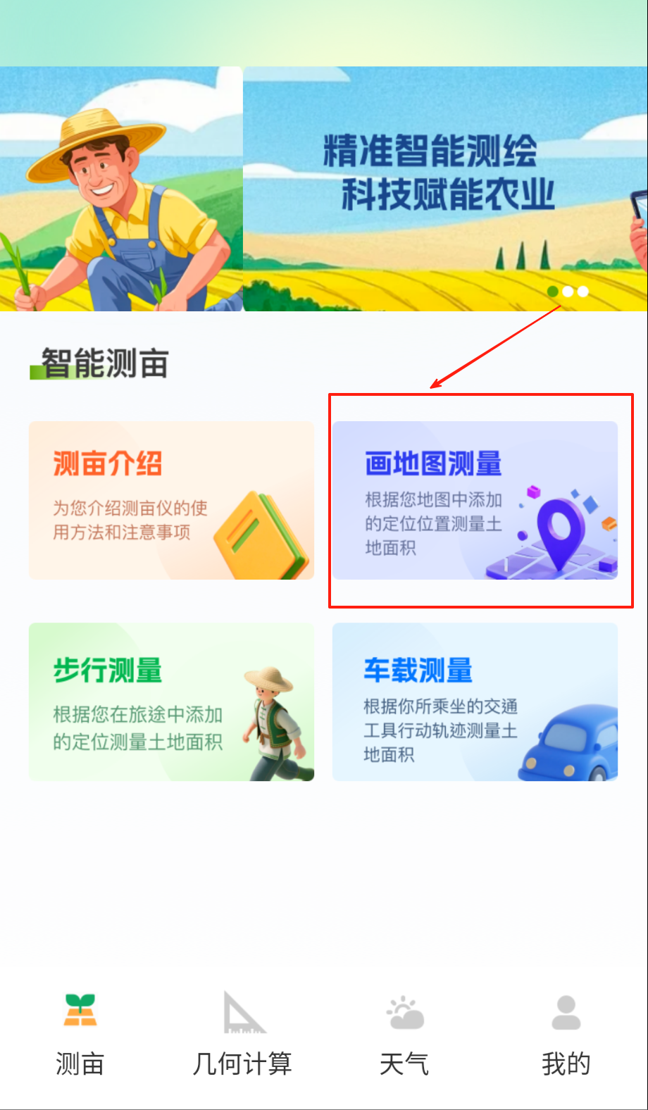 1、启动应用后选择测量模式,画地图测量可在地图上标记地块边界自动计算面积。