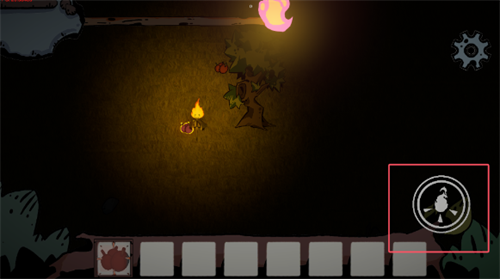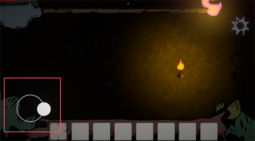1、游戏初始,在黑暗场景中,通过左下角的虚拟摇杆操控角色移动,向篝火方向靠近,篝火可提供光照和可能的安全区域。