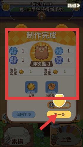 3、看到“制作完成”提示,获取完成关卡的奖励,点击“下一关”按钮,继续挑战新关卡,同时,留意“再上1层获得新手办”等目标提示。