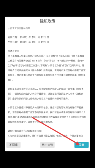 1、进入游戏,点击【同意】。