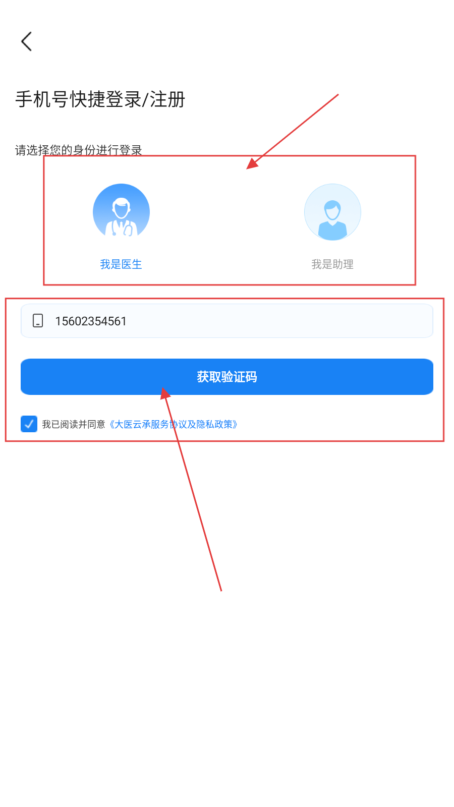 2、在手机号快捷登录/注册页,选身份(如“我是医生”),填手机号,点【获取验证码】,勾选同意协议。