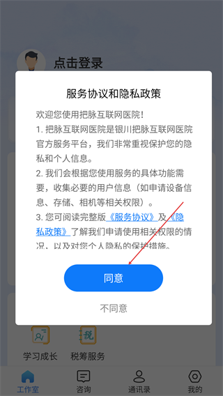 1、在应用启动后的“服务协议和隐私政策”弹窗中,点击【同意】按钮,进入应用主界面。