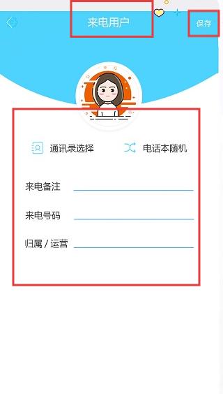 3、进入【来电用户】页,通过通讯录选择或电话本随机设置来电用户信息,点击【保存】完成模拟来电设置。