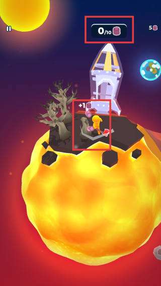 1、游戏中操控角色,在星球场景内挖掘紫色矿石,每挖掘到一块矿石可获得“+1”提示,上方进度条显示收集进度,目标是收集10个紫色矿石。