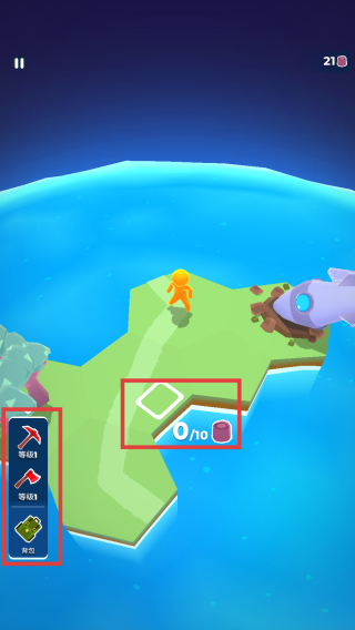 2、留意屏幕左侧工具栏,有等级1的矿镐、斧头和背包选项,合理使用工具提高挖掘效率。当到达新区域,也有类似收集任务。