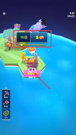 3、在特定场景,可进行资源兑换(如15个紫色矿石兑换5个橙色物品),也可通过点击“获取50”获取额外资源。不断收集和管理资源。