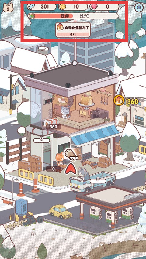 1、游戏中留意屏幕上方资源数值和任务进度,当前任务为“自动化焦糖布丁0/1”,按任务提示推进游戏,完成相关制作或操作。