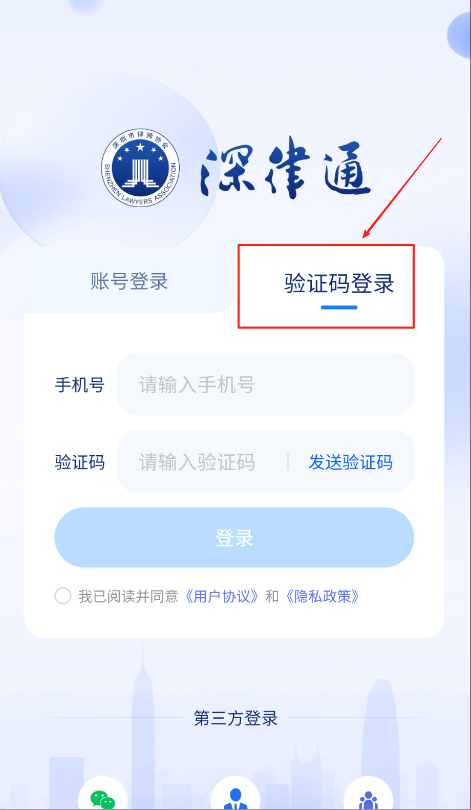 1、 打开手机上的深律通应用进入登录页,选择验证码登录方式,输入自己注册的手机号并点发送验证码,收到短信后填入验证码框。