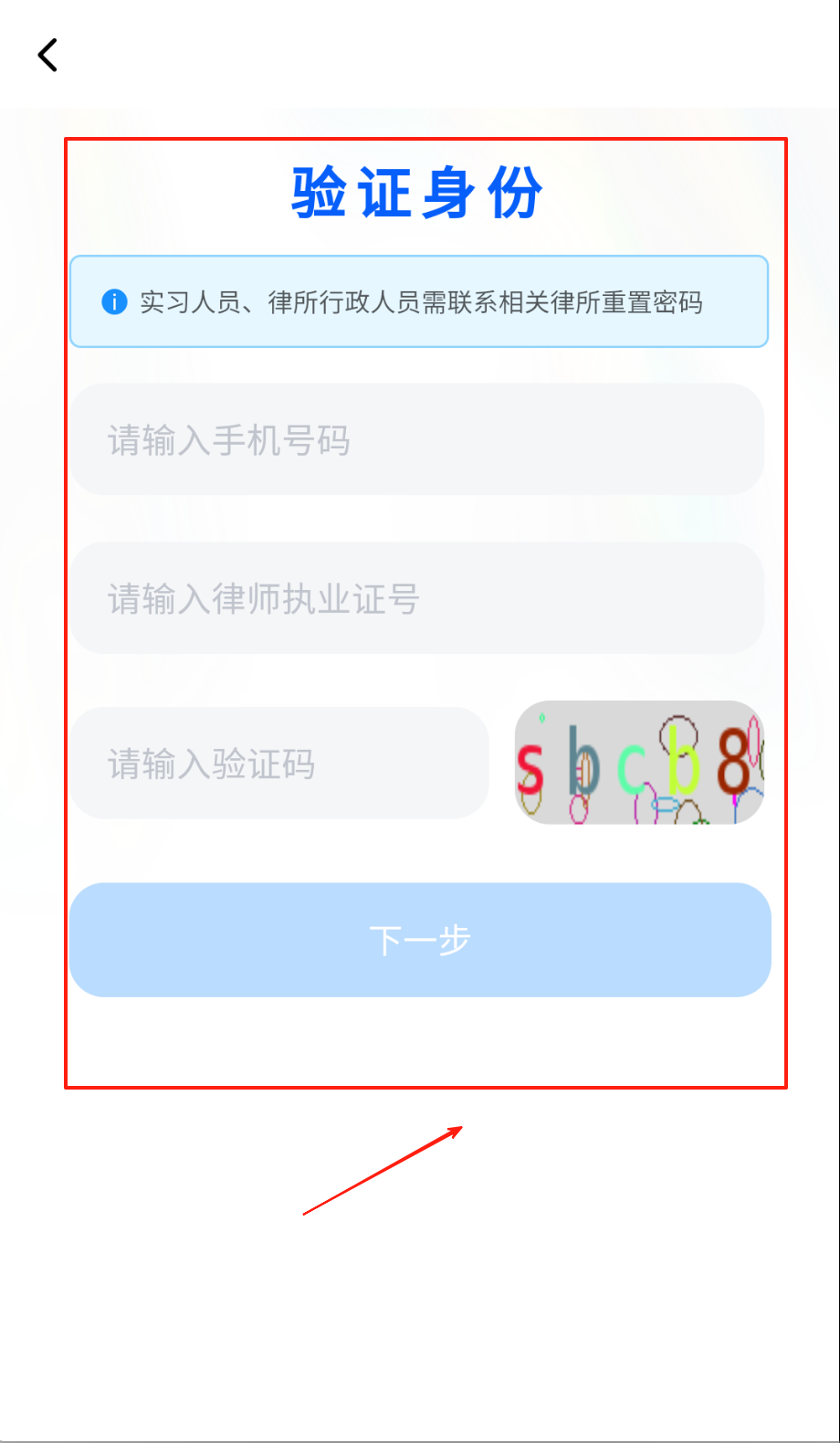 3、 要是实习人员或律所行政需要验证身份,在验证页面填好手机号和律师执业证号,点获取验证码并正确填写。