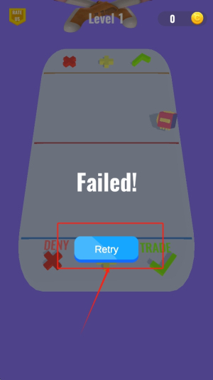 3、重试或继续:如果游戏失败,可以选择点击“重试”按钮再次尝试,或者点击“接受交易”按钮继续游戏。