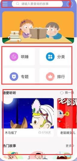 1、打开应用,页面显示搜索栏、哄睡/分类等功能,还有“随便听听”故事推荐,点击对应功能/故事使用。
