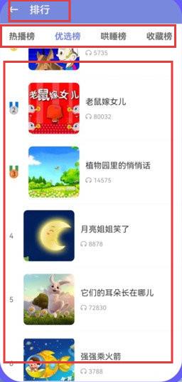2、在【排行】页面,有热播榜、优选榜等分类,点击对应榜单故事(如《月亮姐姐笑了》)入口查找播放。