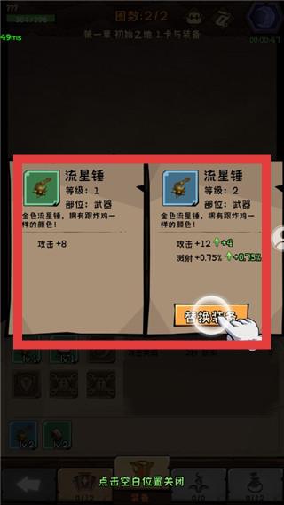 2、遇到装备选择界面,对比装备属性(如流星锤等级1攻击+8和等级2攻击+12等),根据自身策略选择替换装备,提升角色战斗力。