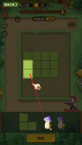1、游戏开始,处于第1/5波防御阶段,倒计时显示剩余时间,初始拥有30资源。点击绿色地块放置植物,如紫色蘑菇等,构建防御阵线。