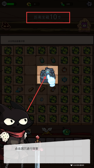 1、游戏开始,明确目标是获取宝藏,此时距离宝藏10步。点击洞穴进行探索,每探索一次,距离宝藏的步数会减少(如从10步变为9步)。