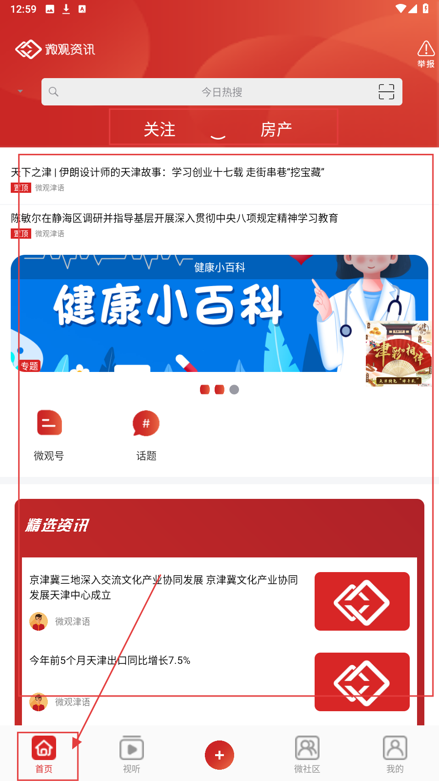 1、打开应用,在【首页】,切换“关注”“房产”等分类,浏览推荐资讯。