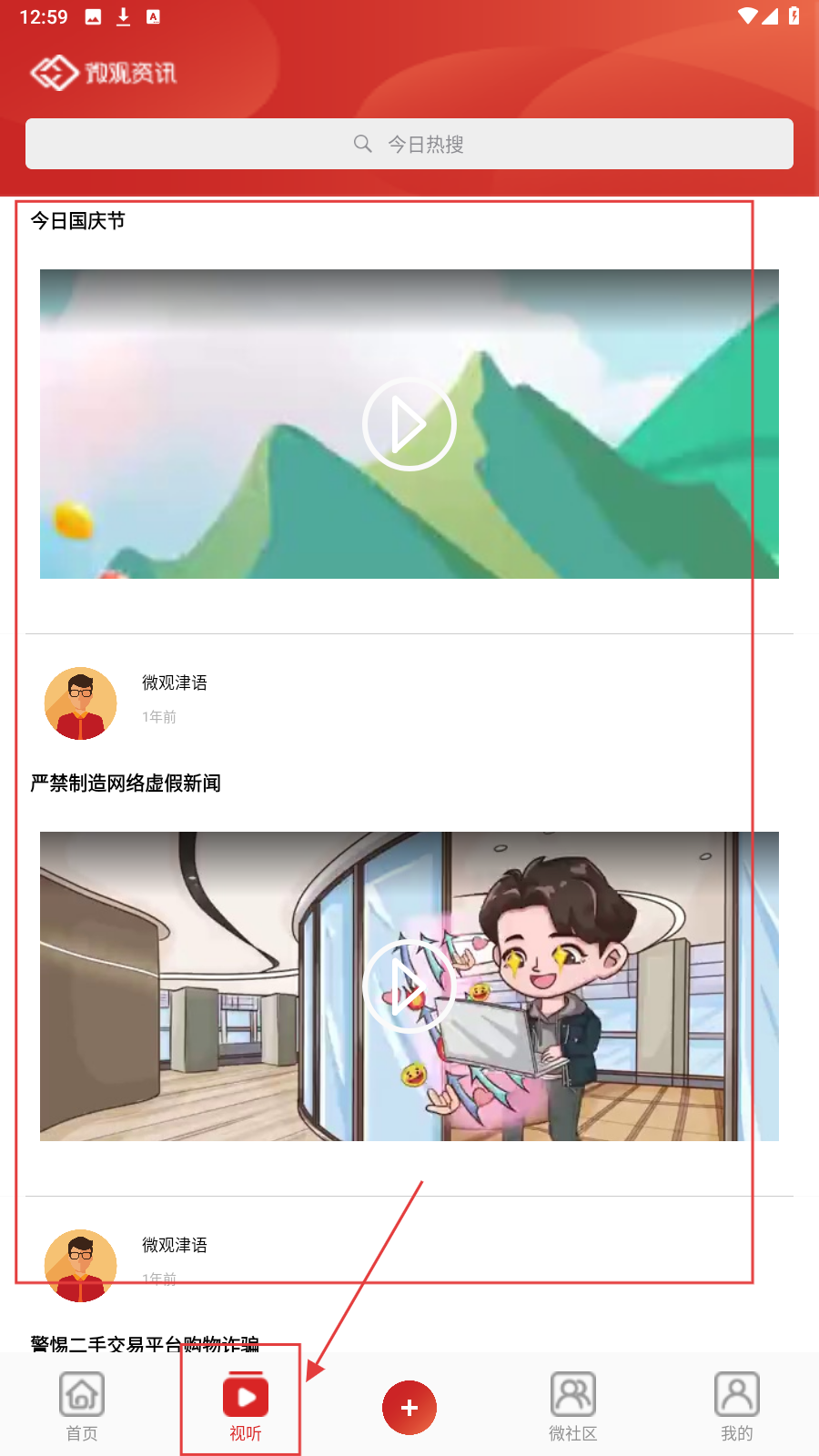 2、选【视听】分类,查看“今日国庆节”等视频内容,点击视频条目进详情。