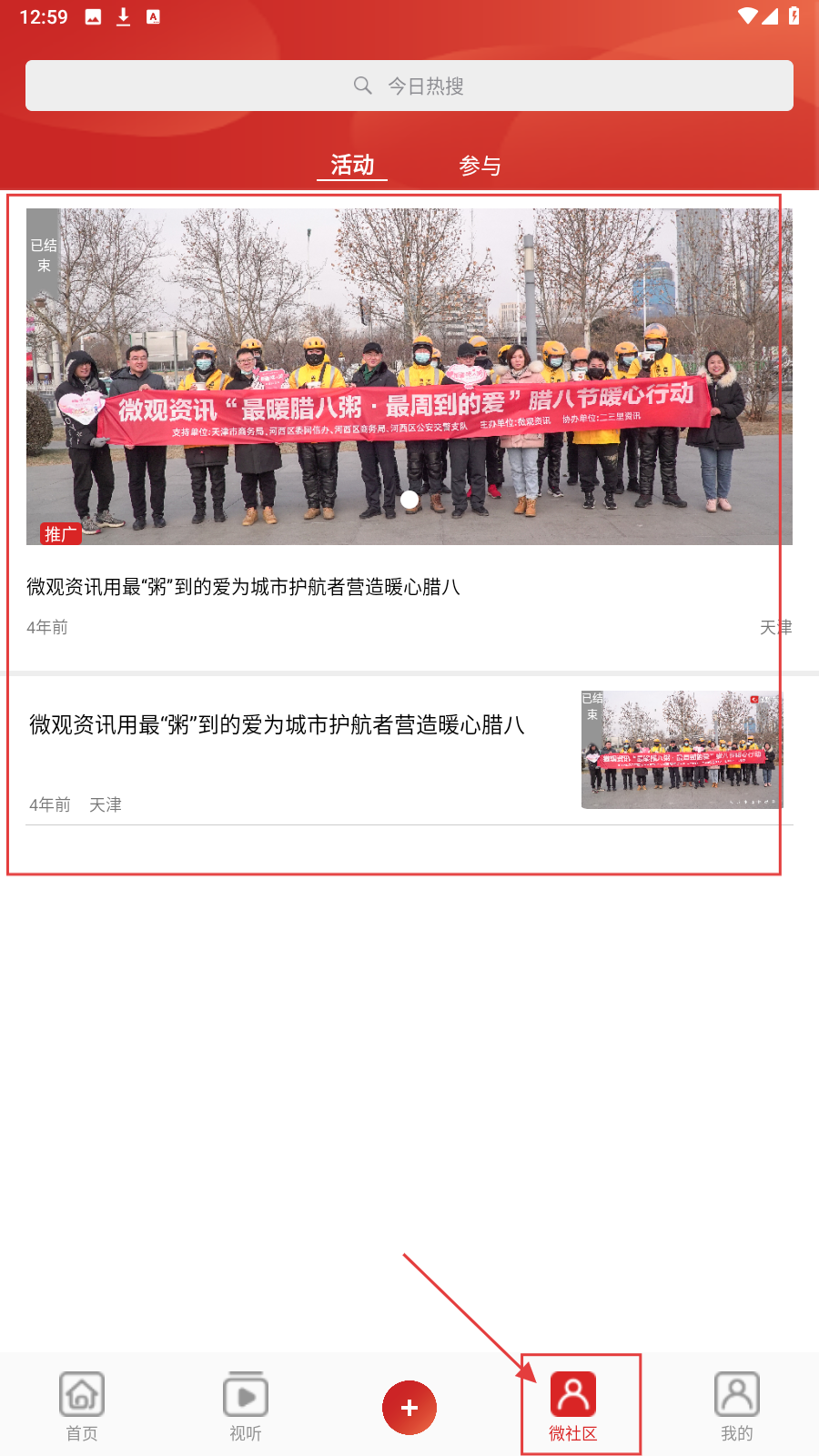 3、进入【微社区】页,浏览“最暖腊八粥”等活动信息,完成互动流程。