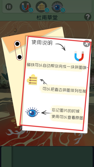 1、游戏中有【磁铁】【拼图排列】【查看原图】道具,【磁铁】可自动完成一块拼图,【拼图排列】能把直边拼图排列在前。